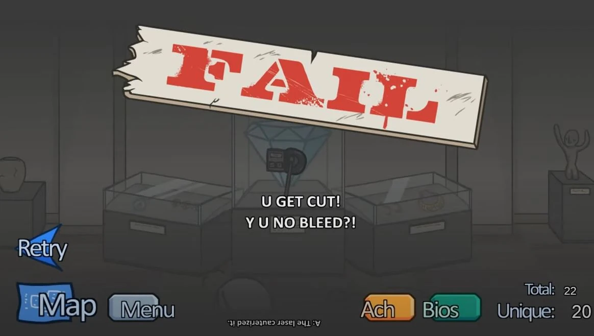 After his descent from the balcony, Henry tries to the Laser Cutter to cut through the glass case of the Tunisian Diamond, but the laser, after a temporary jam, cuts through him instead, leading to a fail which involves Henry getting split in half at the waist and collapsing.