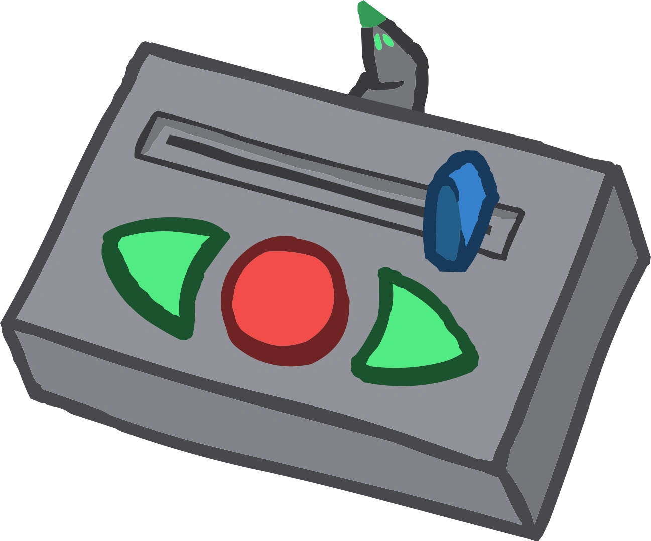 It looks like a console with 2 lime green arrows buttons, a red button in between the arrow buttons and a blue slider above the buttons, it also has a bent antenna at the top of the device with a green bulb.