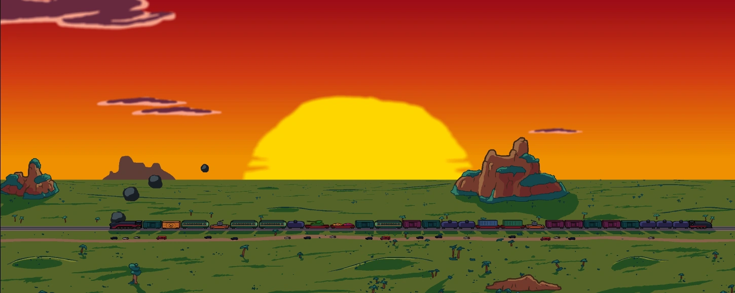 The train consists of multiple Cargo and passenger Carts, including The Golden Money Cart that contains all the Toppat's money. On the exterior, most of the train is reinforced with metal plating, it seems to be coal-powered judging by the smoke coming out of the locomotive, and it has Carts detachable from the bases (as can be seen in the By Air and By Sea choices in “Little Nest Egg”). The train has a total of 26 Carts, excluding the locomotives.